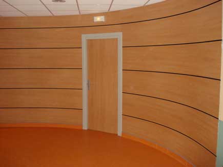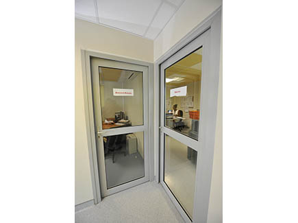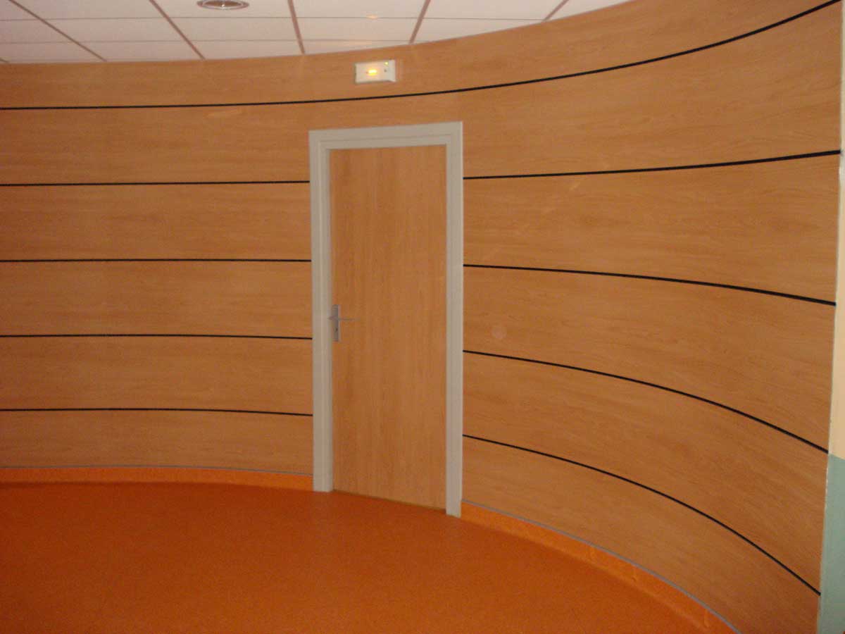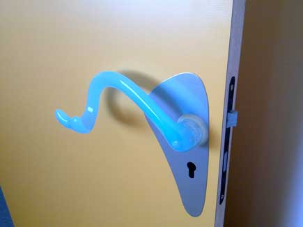 Porte stratifiée avec poignée spécifique et plaque de protection -