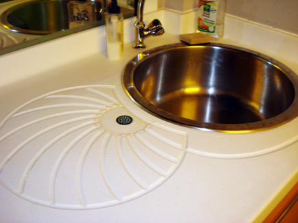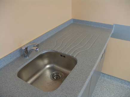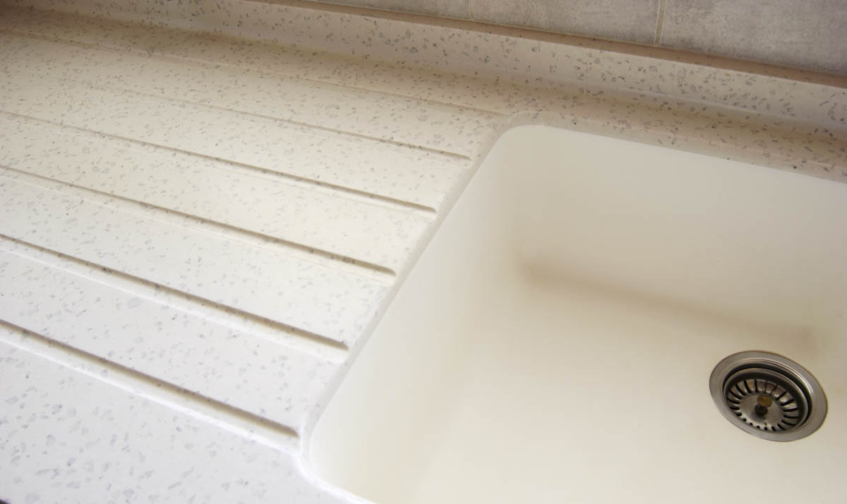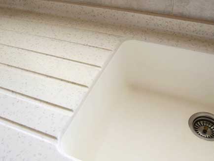 Plan de cuisine en résine avec intégration évier inox rond et égouttoir assorti -